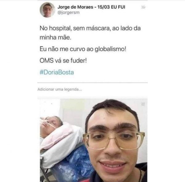 “No hospital, sem máscara, ao lado da minha mãe. Eu não me curvo ao globalismo. OMS vá se fuder! #DoriaBosta”, esbraveja o garoto.